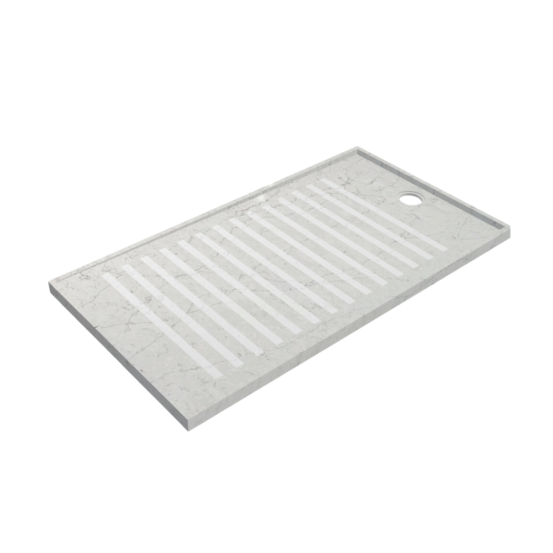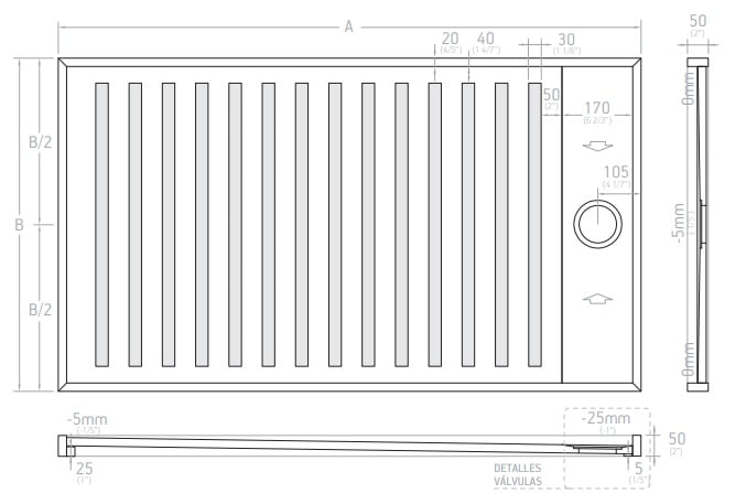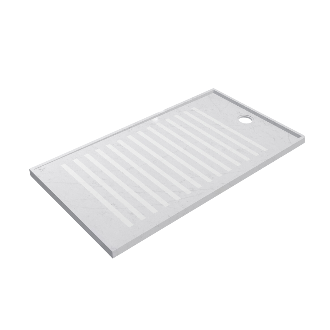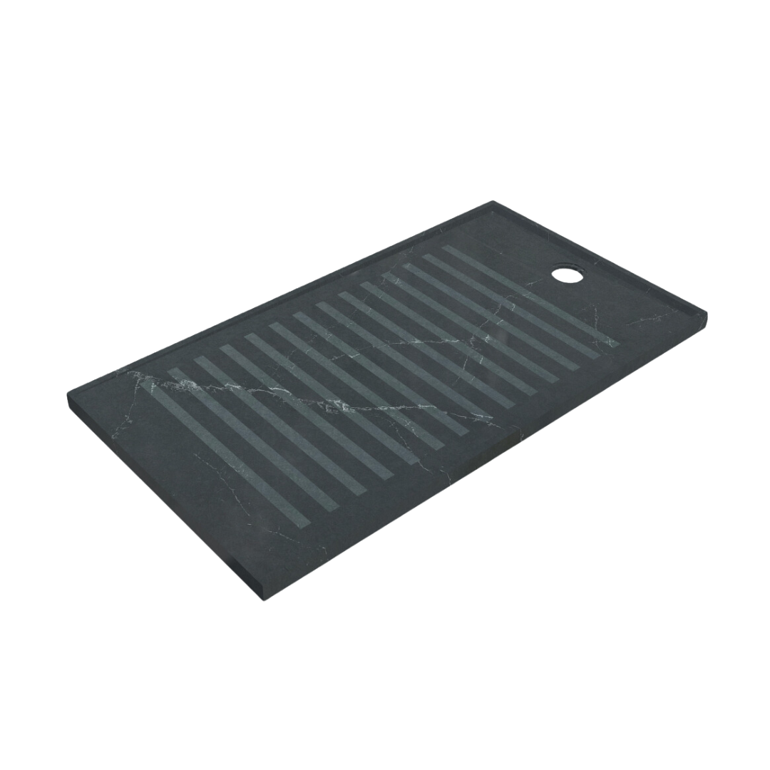 Su diseño de enmarcado perimetral completo garantiza la estanqueidad del agua durante la ducha. Con pendiente de evacuación hacia una zona de recogida lineal que se extiende en todo su ancho.